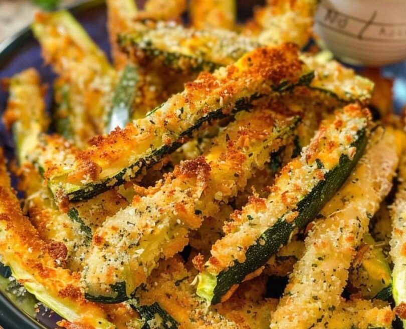 Preheat oven to 425°F (220°C).In a bowl, mix breadcrumbs, Parmesan, garlic powder, oregano, salt, and pepper.Dip zucchini sticks in eggs, then coat with breadcrumb mixture.Place on a baking sheet.Bake for 20-25 mins.