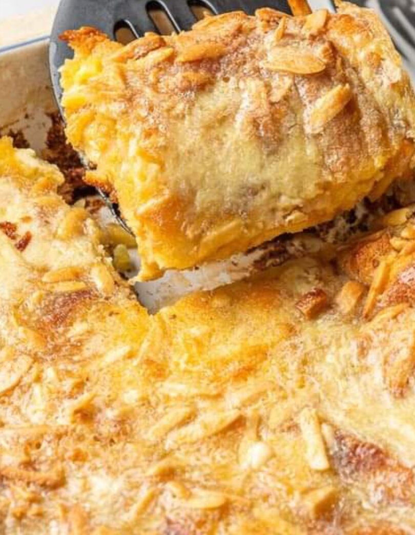 Pour bread into a greased 9”x13” baking dish and pour egg mixture on top. Bake for 45 minutes or until bread on top is golden brown. Tent for final 15 minutes if browning too quickly.