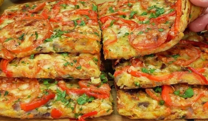 Finish the casserole: Take the baking dish out of the oven after 25 minutes. Put sliced bell peppers, tomatoes, and grated cheese on top.