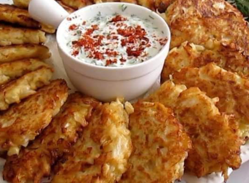 Serve the hot cabbage fritters with a dollop of the yogurt-dill sauce on top.