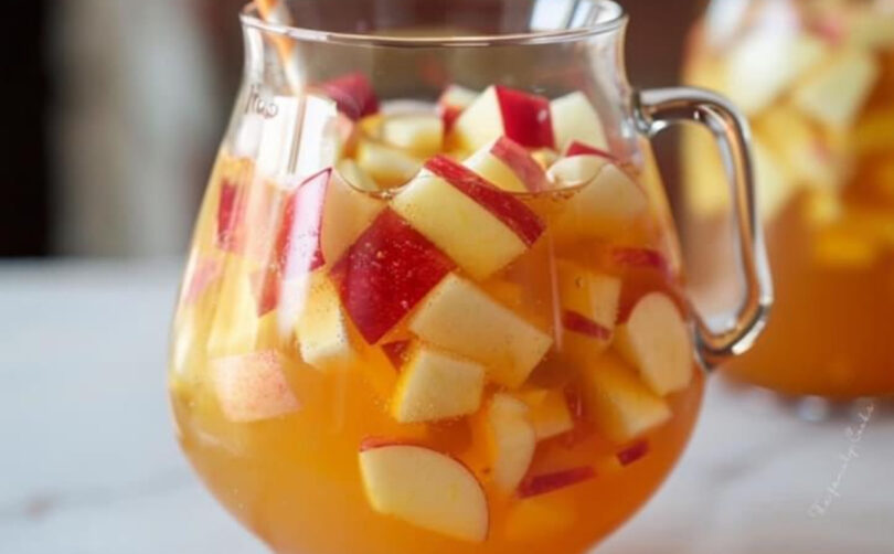 Add the moscato, apple cider, green apple vodka, and caramel vodka to a large pitcher. Stir well to combine.