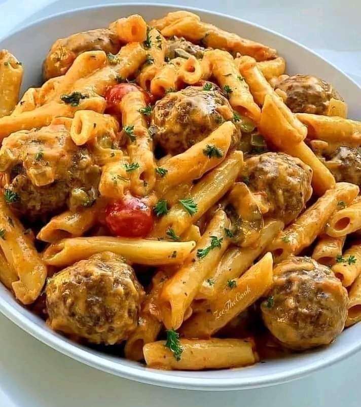 Penne pasta with meat balls is one
