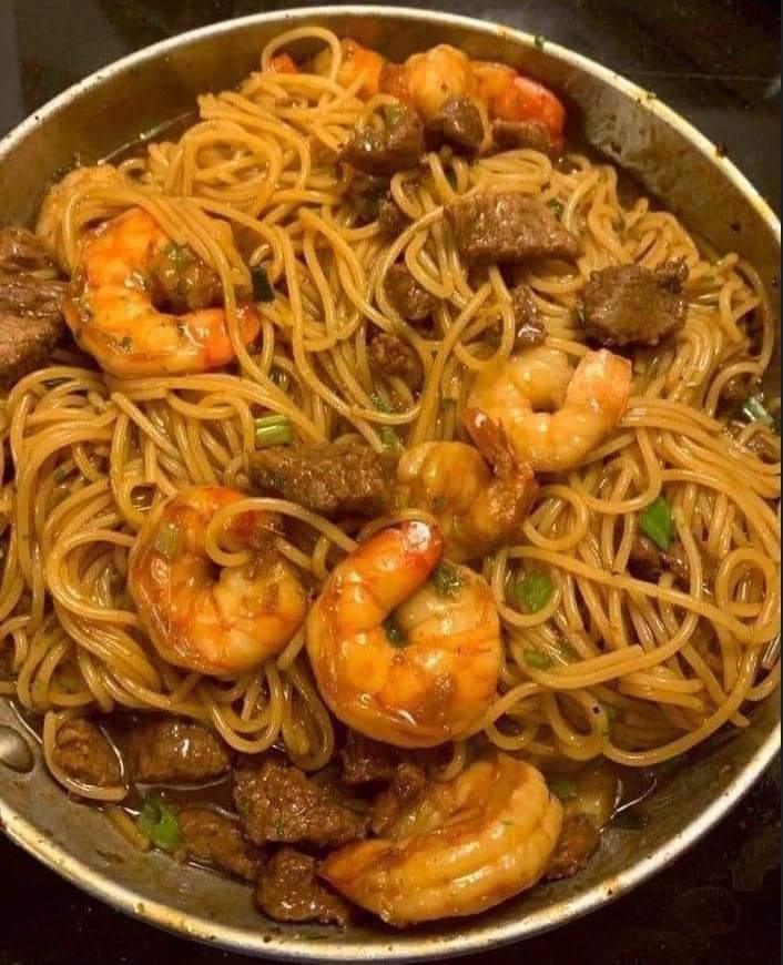 Shrimp and steak teriyaki noodles