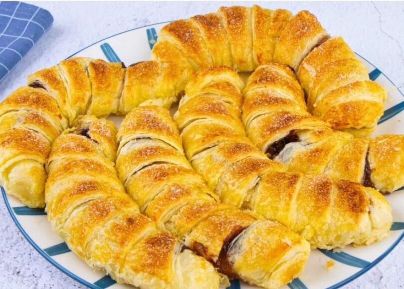 Roll out the puff pastry on a cutting board and cut into strips.