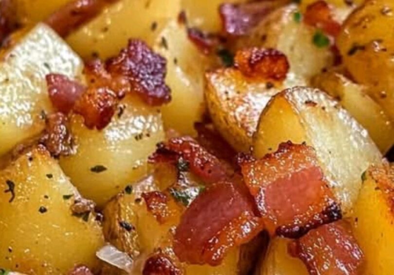 This recipe combines sliced potatoes, onions, and bacon roasted together in the oven. The potatoes develop a crispy exterior while retaining moisture inside. Bacon adds savory flavor and crisp texture. Cooking occurs entirely in a standard oven.