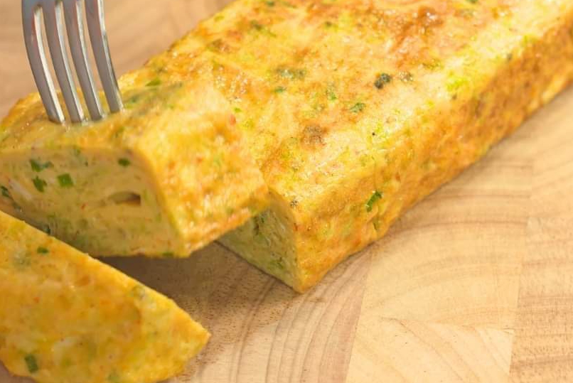 Take the egg roll out of the pan and cut it into small pieces.