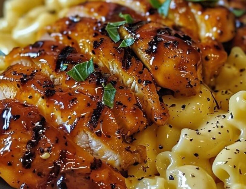 Plate the creamy macaroni cheese and top with honey pepper chicken strips.